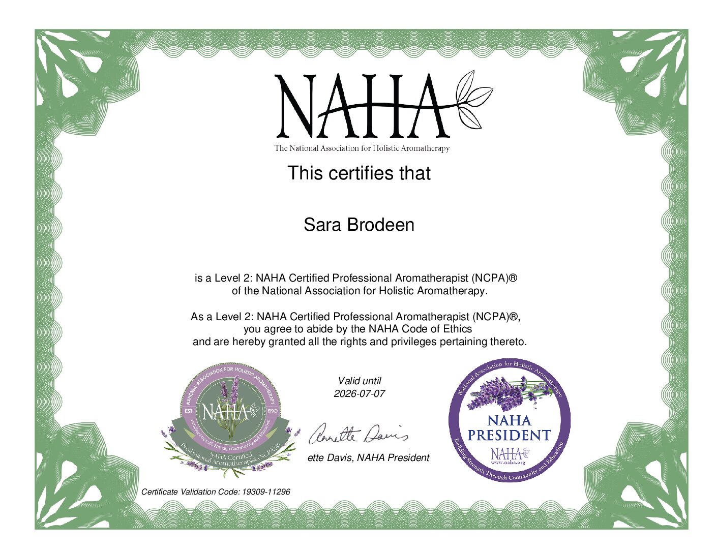 I have earned the title of Master Clinical Aromatherapist by successfully completing a comprehensive certification program that involved 850 hours of intensive training, and I also hold a Level 2 certification from the National Association for Holistic Aromatherapy.