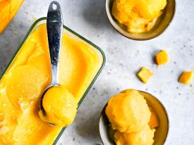 This refreshing, dairy-free ice cream combines the tropical sweetness of mango with a zesty lime twist, perfect for a summer treat.